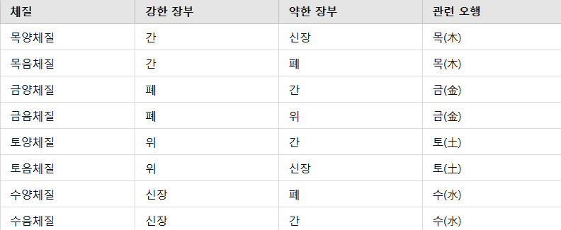 - 사람마다 장기(간, 폐, 위, 신)의 기능적 우위와 약점이 다르기 때문에 이에 따라 체질이 결정됩니다.